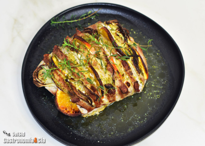 Primero sala la pieza de lomo por todas partes, entre cada corte, por los lados y por la parte inferior. A continuación rellena cada corte de la cinta de lomo con hinojo, naranja y cebolla.
