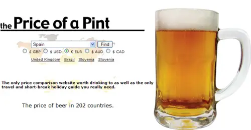 Aparece una lista que muestra el precio de la cerveza en diferentes ciudades españolas y las variaciones son brutales, llegando en algunos casos a casi igualar el precio de la cerveza del Vaticano, es el caso de los 7,50 euros de Elda (Alicante). Cada país seleccionado ofrece los distintos precios que se mueven en las ciudades de las que se han obtenido datos. En algunas localidades se indica que el coste es de 0 euros, lo que quiere decir que no existen datos.