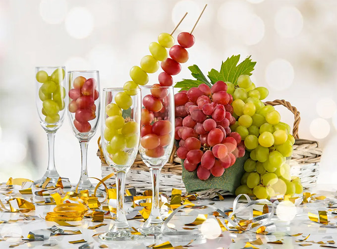 Si hay niños, ya sabéis que las uvas se deben cortar, no hace falta que se coman doce uvas, pueden comerse doce trozos. Dependiendo de la edad de los pequeños, no los cortéis por la mitad, sino en cuartos, así podrán seguir el ritmo de las campanadas y se sentirán muy contentos al ser partícipes de la celebración. Del mismo modo conviene preparar las uvas a las personas muy mayores o con ciertas dificultades para ingerir alimentos.