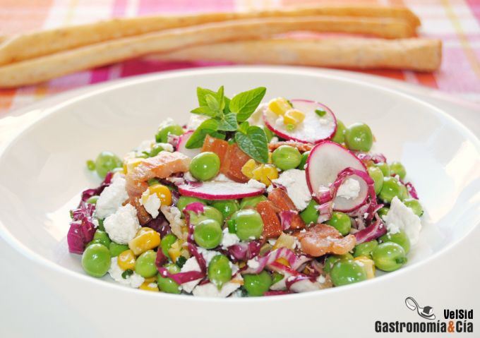 Ensalada de guisantes frescos y requesón (sin bacon)