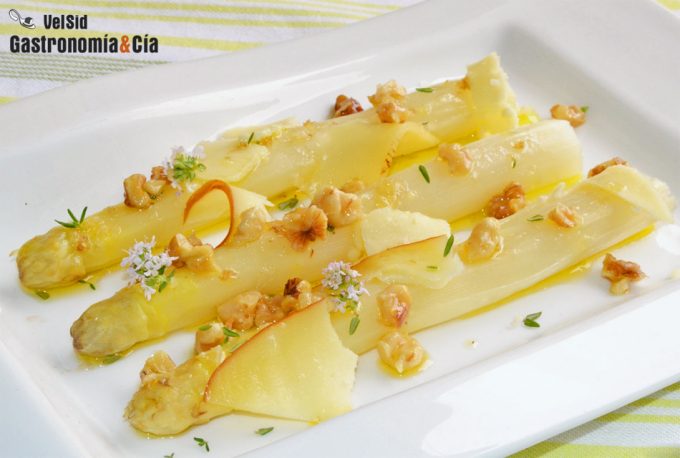 Espárragos de Navarra con salsa de cebolla y avellanas