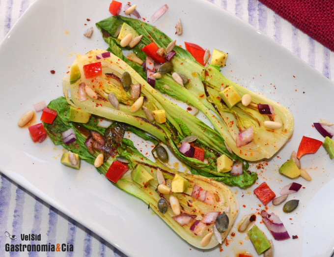 Ensalada templada de pak choi con aguacate y semillas