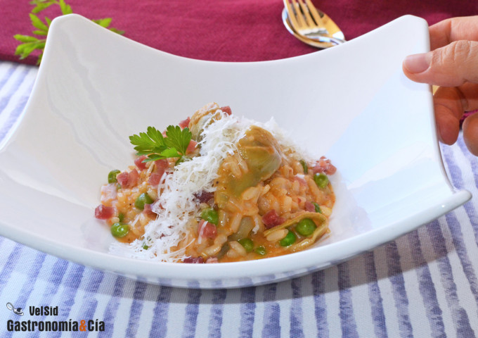 Risotto de alcachofas, guisantes y jamón