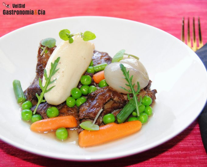Ternera con guisantes, cebolla marinada y avellana