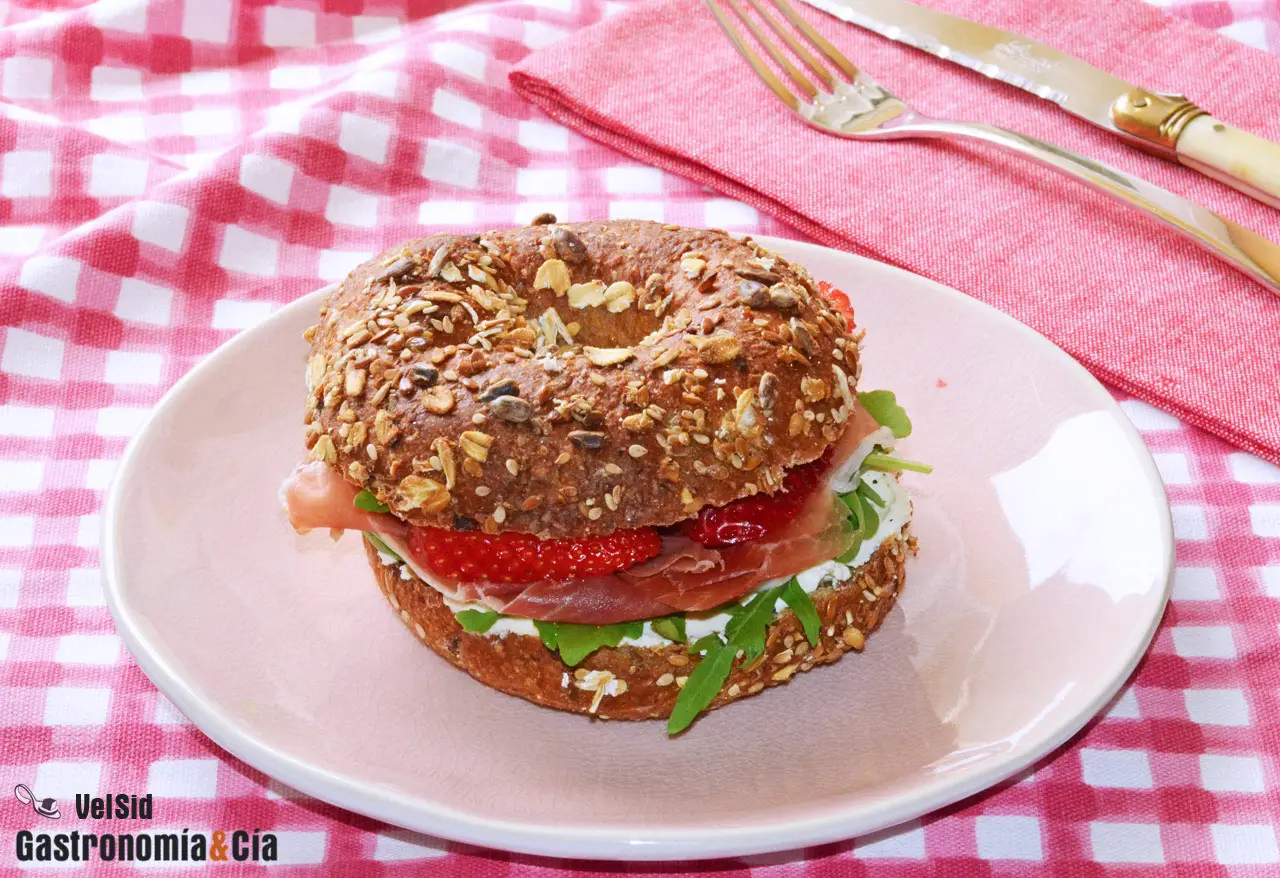 Y en esta nueva entrega, este nuevo recopilatorio dominical, vais a encontrar recetas de desayunos con fresas dulces y salados, para todos los gustos también, desde tortitas y crepes, pasando por algún bizcocho en microondas, a unas tostadas o sándwiches, como el de jamón serrano con fresas en pan tipo bagel con semillas, está para repetir y no sólo en el desayuno, puede ser una merienda e incluso parte de una cena informal con la que conquistar a toda la familia. Dicho sea de paso que los panes que utilizamos en las recetas que veréis bajo estas líneas los podéis cambiar por el tipo de pan que más os guste o que tengáis en casa. Del mismo modo, las tortitas o creps que hagamos con un tipo de harina, por ejemplo, avena o espelta, también las podéis hacer con harina de trigo si es la que soléis consumir.