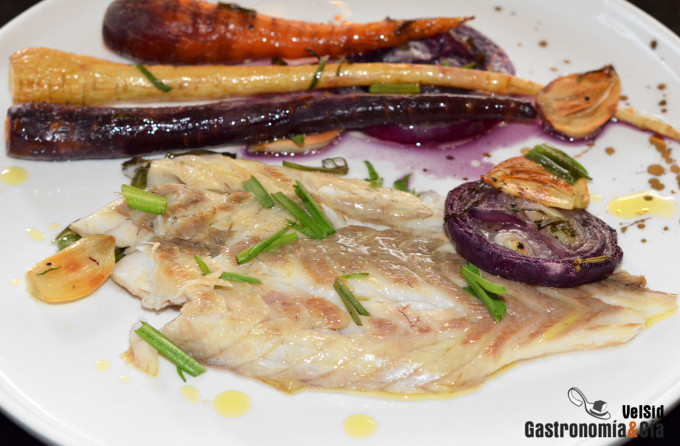 Corvina al horno con zanahorias y chirivías