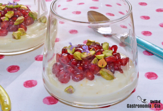 Pudin cremoso de chocolate blanco, naranja y granada