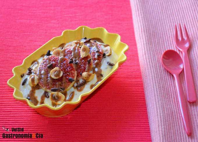 Yogur griego con chocolate, higos y mantequilla de avellanas