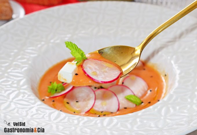 Salmorejo con sardinas, esferas de tomate y hierbabuena
