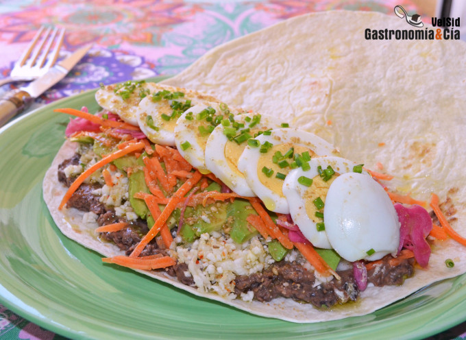 Tacos de fríjoles negros, coliflor, aguacate y huevo