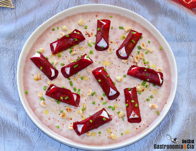 Crema de remolacha y queso de cabra suave