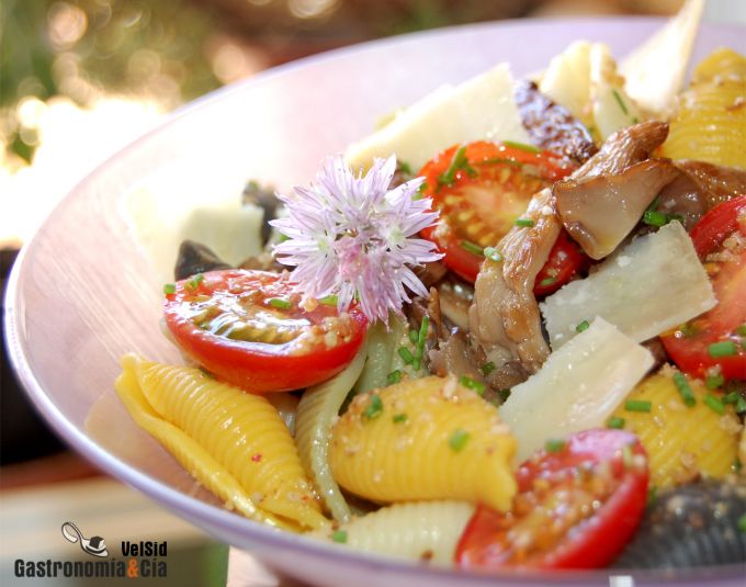 Ensalada de pasta, setas de cardo y parmesano