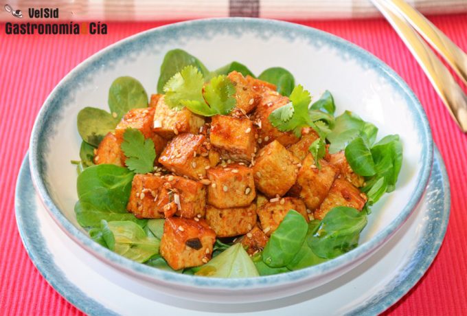 Ensalada de espinacas baby, garbanzos y tofu marinado
