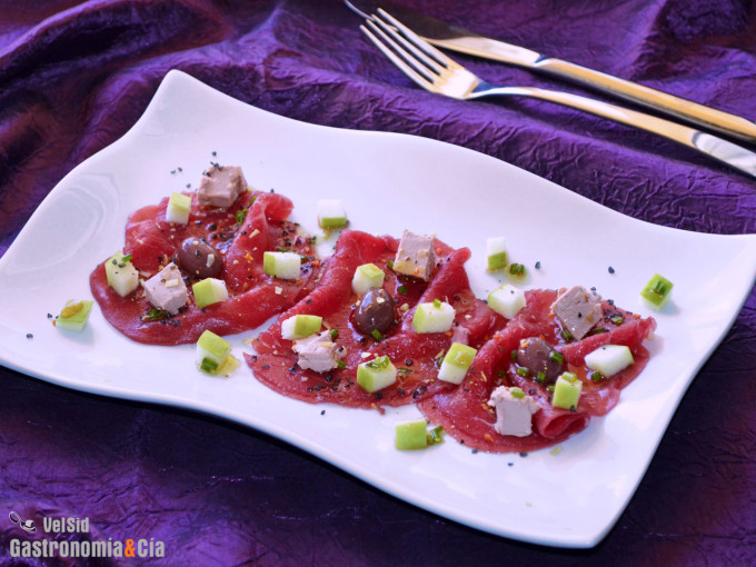 Carpaccio con bloc de foie, aceituna esférica y aderezo de Oporto