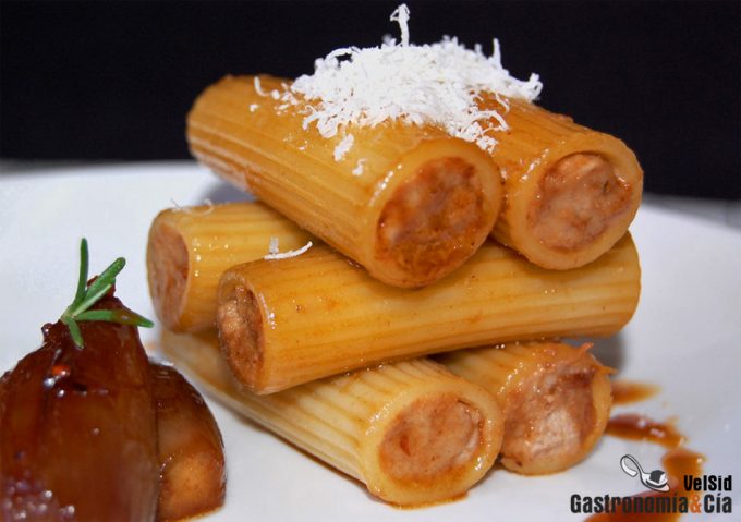 Rigatoni rellenos de cordero con chalotas caramelizadas