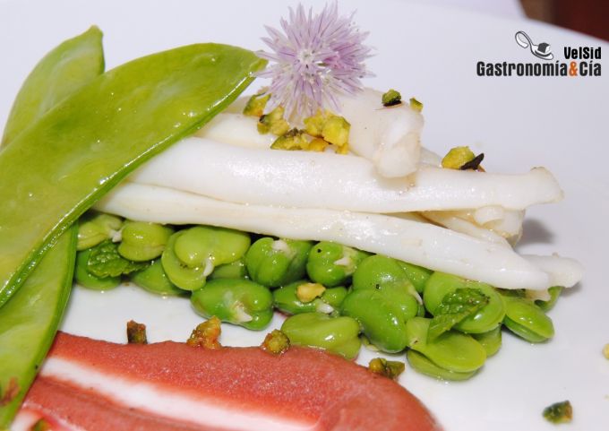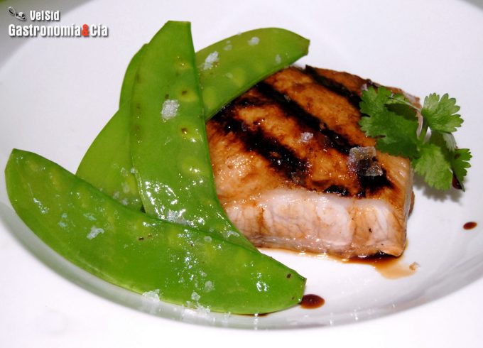 Salmón ahumado y tirabeques con salsa de coco y wasabi