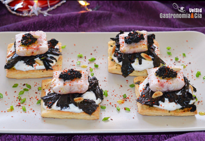 Canapé de anguila ahumada y trompetas de la muerte