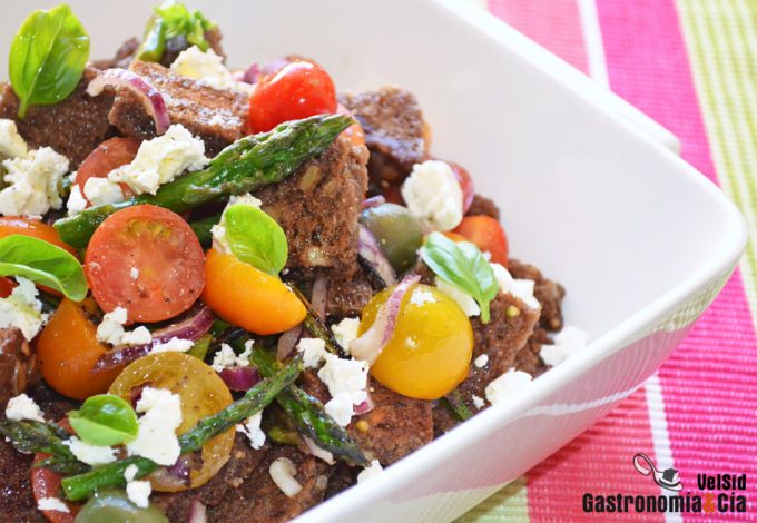 Ensalada de fresas, tomates secos en aceite y queso feta