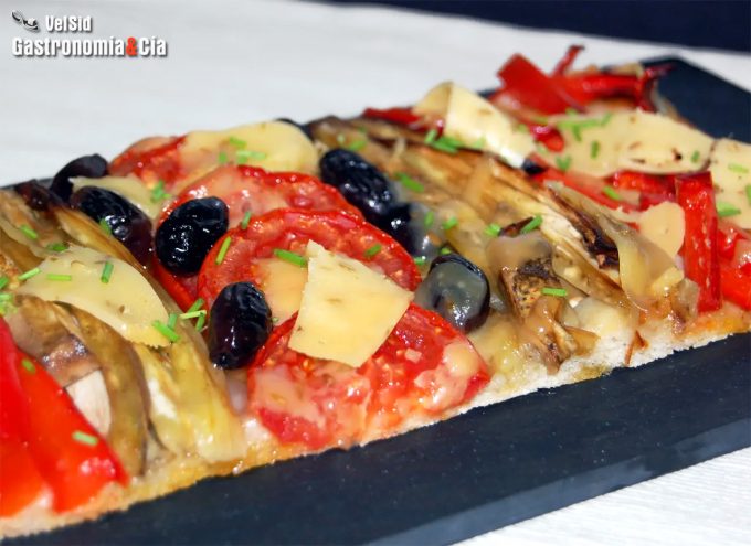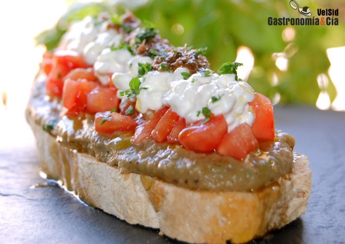 Tosta de berenjena, tomate, cottage y aceite de anchoa