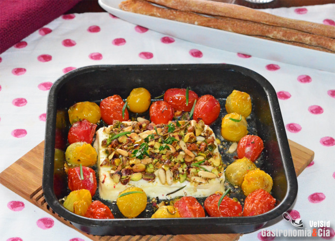 Queso feta caliente con tomates cherry, piñones y pistachos