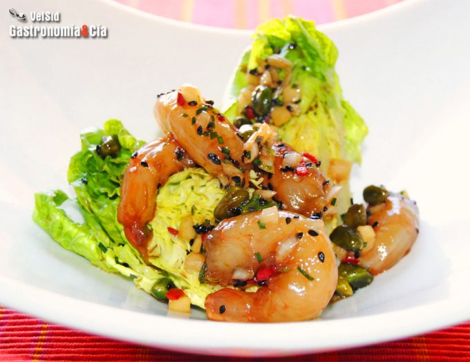 Cogollos a la plancha con salmón y vinagreta de pimientos