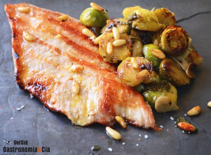 Secreto de cerdo con coles de Bruselas, limón y parmesano