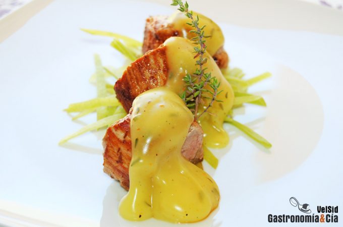 Solomillo con glaseado de arándanos y parmentier de romero y ajo