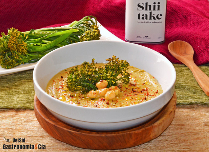 Crema de calabacín y queso de cabra con picatostes y aceitunas