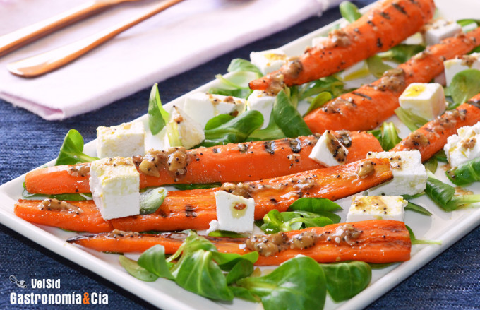 Zanahorias a la parrilla con requesón y vinagreta de semillas