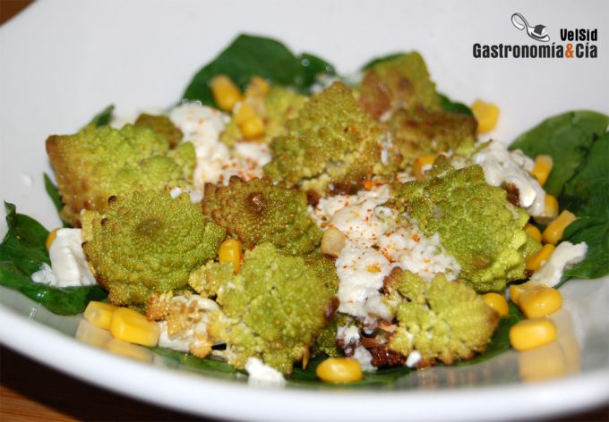 Coliflor asada entera con salsa de sésamo y mostaza y hierbas aromáticas