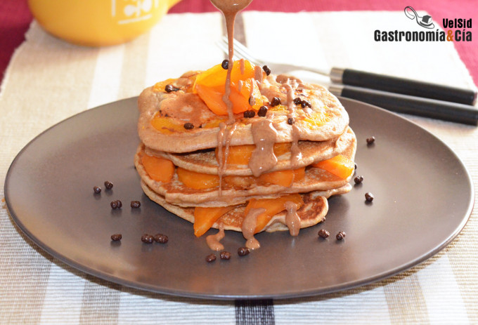 Tortitas de avena con caqui y sirope de avellanas