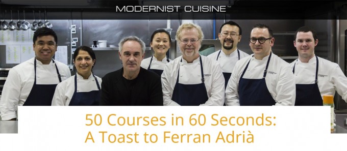 El equipo de Modernist Cuisine ha compartido un vídeo titulado 50 platos en 60 segundos: Un brindis por Ferrán Adrià, es el vídeo que podréis ver a continuación. Lo que nos muestran las imágenes sucedió el pasado mes de marzo, cuando Ferrán Adrià estaba de gira de promoción de elBulli 2005-2011, el nuevo catálogo del restaurante que completa la obra que permite estudiar qué ha sido elBulli, cómo ha funcionado… como ya os comentamos, esta obra publicada por Phaidon se compone de siete volúmenes, uno por cada año, y contiene más de 750 recetas y el doble de fotografías.