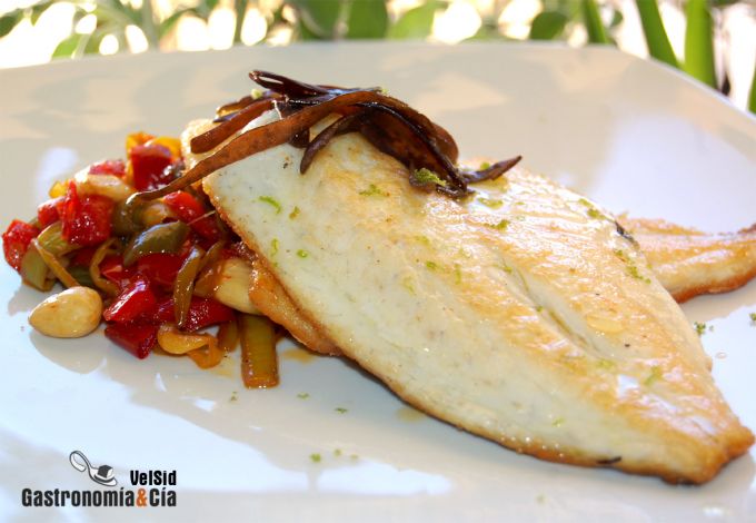Dorada con verduritas salteadas y espagueti de mar
