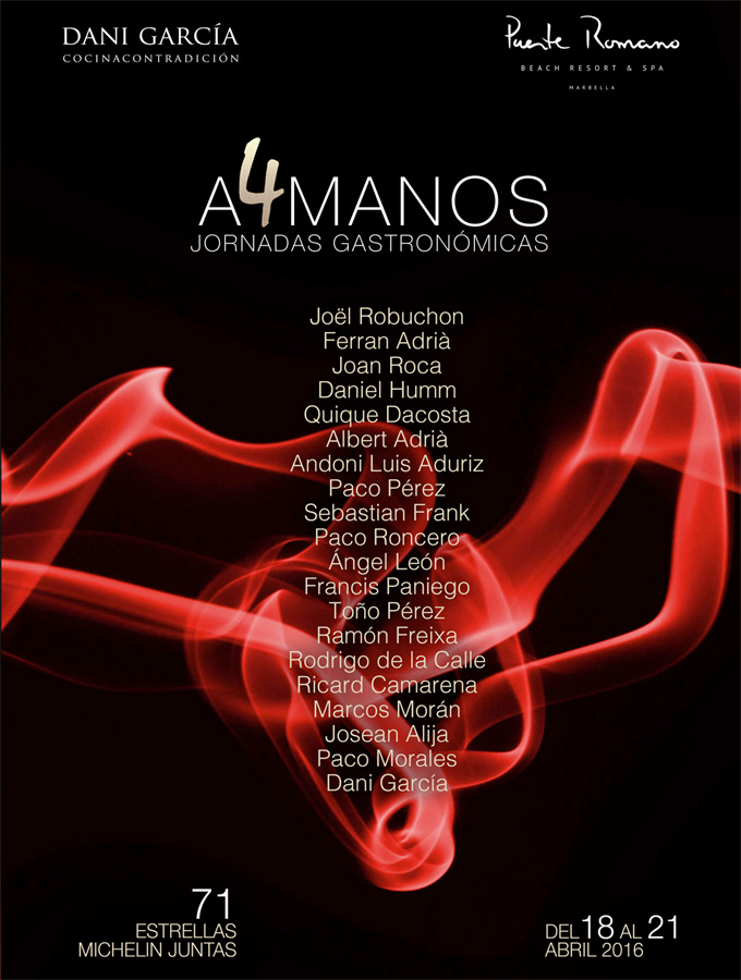 Por tercer año consecutivo, el chef malagueño Dani García ha organizado las jornadas gastronómicas A Cuatro Manos que tendrán lugar en su restaurante gastronómico ubicado en el Hotel Puente Romano de Marbella el próximo mes de abril. Ya ha presentado las cenas y a los cocineros invitados de esta nueva edición, y sin duda, va a hacer levantar de la silla a muchos amantes de la gastronomía para organizar su viaje a Marbella.