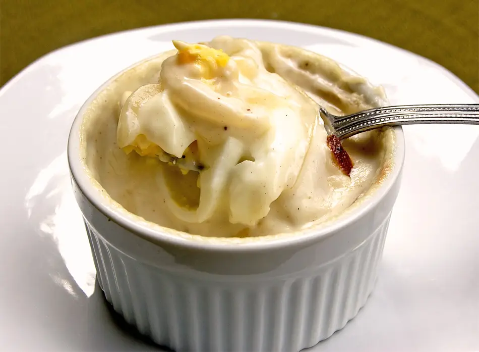 Los Oeufs à la tripe son básicamente unos huevos duros que se cortan en rodajas y se napan con una bechamel espesa. Sobre ella se sirve cebolla pochada en mantequilla, y después se pueden gratinar o no.