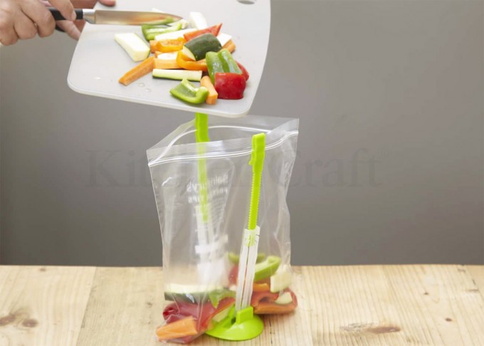 Según lo que queramos introducir en estas bolsas de conservación necesitaremos la ayuda de alguien, que nos sujete la bolsa abierta y en posición vertical, tal y como lo hace el Bag Opener and Holder de Kitchen Craft, aunque también hay otros fabricantes de este accesorio, como Jokari, que lo comercializa como Baggy Rack Pro (aunque no hablan tan bien de él).