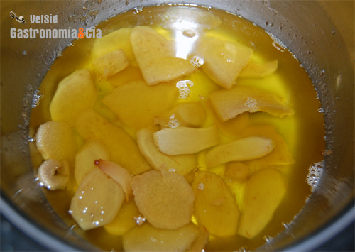 Pela el jengibre y córtalo en finas rodajas, ponlo junto al aceite en un cazo y llévalo al fuego, es interesante disponer de un termómetro de cocina para controlar la temperatura, pues debes confitar el jengibre a 65-70º C durante 3 horas.