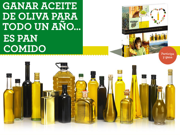 Han creado un minisite en el que se puede encontrar toda la información sobre esta campaña, como veis en la imagen que encabeza este post, Ganar aceite de oliva para todo un año… es pan comido, pero además encontraremos información sobre la variedad de aceites, el oleoturismo, algunas recetas, y el concurso para ganar el aceite de oliva para un año para lo que sólo será necesario introducir los datos, que les servirán para realizar estudios de mercado, y disponer de un ticket de compra de aceite de oliva en cualquiera de sus variedades, que tenga la fecha especificada, desde el 23 de mayo hasta fin de la campaña, el 23 de julio.