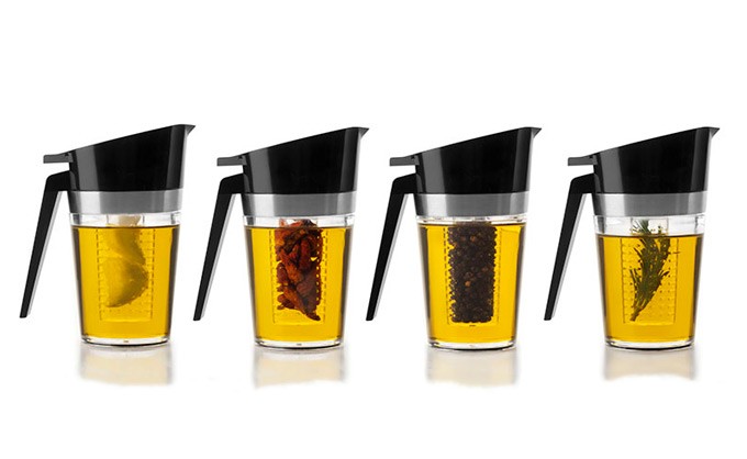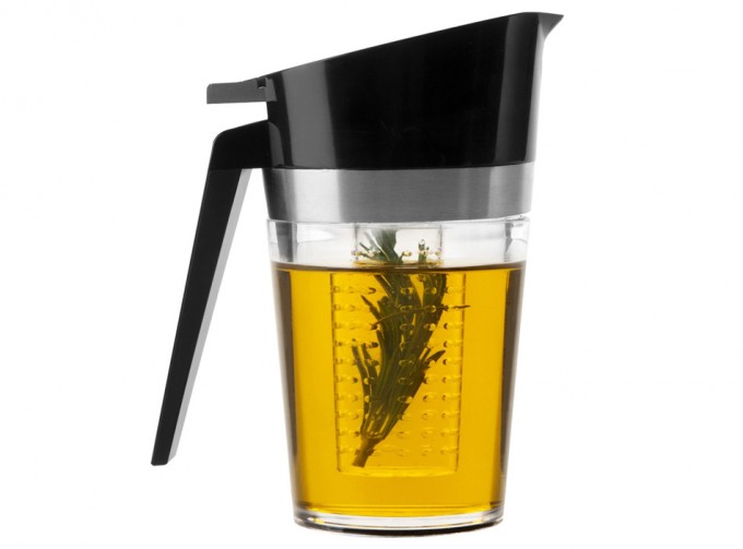 También hay que decir que para aromatizar aceites no se necesita ningún utensilio de cocina especial, no obstante, en el mercado se pueden encontrar accesorios que intentan facilitar su elaboración y conservación, un ejemplo es el que veis en las fotos, se trata de una aceitera aromatizadora diseñada por la empresa española Lacor, fabricante de utensilios y menaje para la cocina profesional.