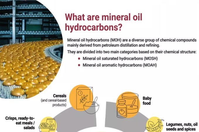 Recientemente la EFSA (Agencia Europea de Seguridad Alimentaria) ha realizado una actualización de la evaluación de riesgos de hidrocarburos de aceites minerales en los alimentos, además, ha publicado una infografía en la que se explica muy resumidamente qué son los hidrocarburos de aceites minerales, los tipos de sustancias que los forman, en qué alimentos pueden estar presentes, etc.