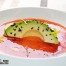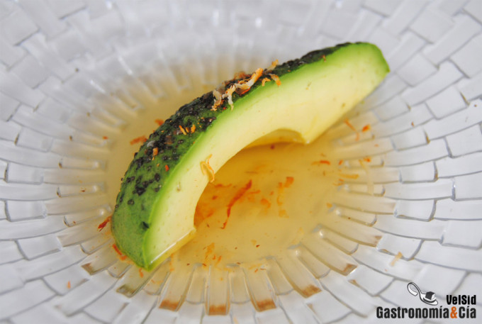 Disponer el aguacate en el plato, y ya en la mesa, servir el caldo dashi de gambitas, cubriendo el fondo del plato. Dar dos toque de ralladura de hueso de aguacate pelado, éste dejará un leve aroma a cilantro al plato.