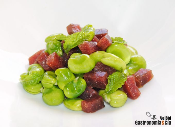 Prepara primero las habas y la mojama, retira las habas de las vainas y después pélalas, retirando la piel que las recubre resultarán más suaves. Corta la mojama en daditos y pon ambos ingredientes en un bol, adereza con aceite de oliva virgen extra y las hojas de hierbabuena fresca, mezcla bien y reserva en el frigorífico.