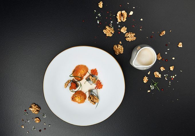 Seguro que conocéis el ajoblanco tradicional, es una sopa de almendras tradicional de la cocina andaluza que se suele servir con uvas, pero el concepto, la idea de esta sopa da pie a hacer muchas variantes, de hecho, en el blog podéis encontrar varias recetas de ajoblanco con almendras y con otros frutos secos, así como con distintas guarniciones. Hoy tenemos una nueva propuesta para hacer esta sopa fría en la sección ‘Recetas del Chef’, ilustrando estas líneas podéis ver la presentación del Ajoblanco de nueces con sardina ahumada de Sergio y Javier Torres.