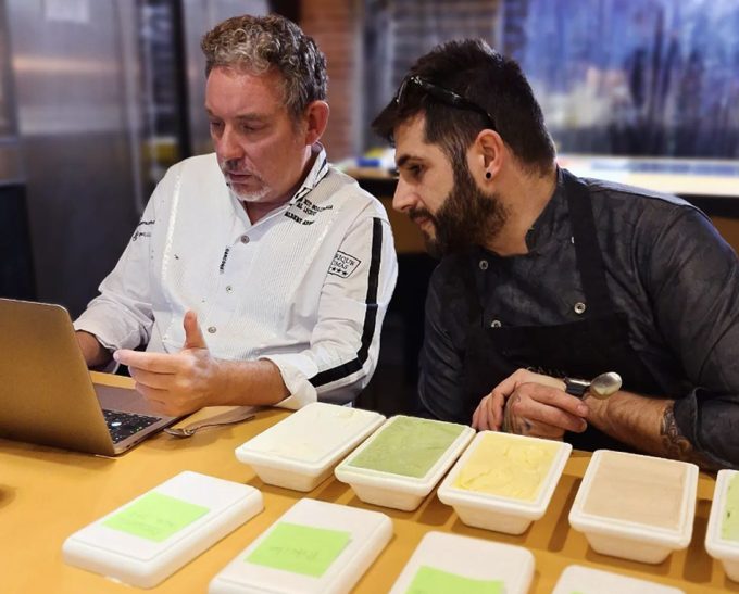 Según muestran en el perfil de Instagram de la nueva heladería de Albert Adrià y sus aliados, están revisando todas las pruebas de helados que van a elaborar estos ‘dos meses, duro y placentero trabajo’, van a razón de unos 20 helados por semana, probando alternativas de ingredientes, evaluando su calidad, redondeando texturas… Si queréis verlo y seguirles, podéis pulsar aquí @gelato.collection.
