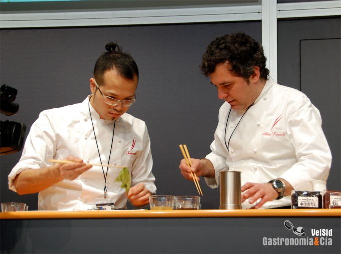 Con estas explicaciones y entre otras, la de los distintos tipos de dashi (vegetal, con bonito o con vieira seca), los asistentes a la ponencia disfrutamos de la degustación de un dashi soluble que encontramos muy diferente a los tradicionales, con un pronunciado sabor ahumado. Los dos siguientes caldos que probamos sí ofrecían más sabor a pescado, uno con más intensidad que el otro.
