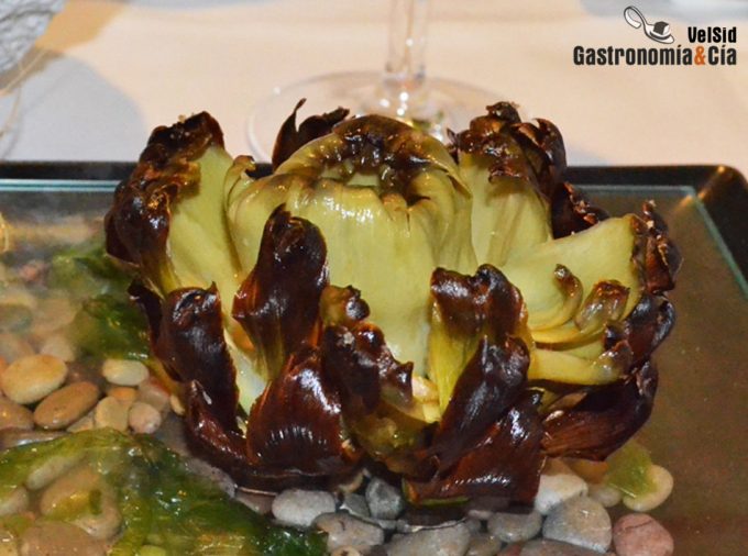 La alcachofa de Benicarló en dos pasos se presenta pinchada en un palillo, en piedra. Y en mesa, delante del comensal, se abre y se termina con un hilo de aceite de oliva virgen extra y escamas de sal.