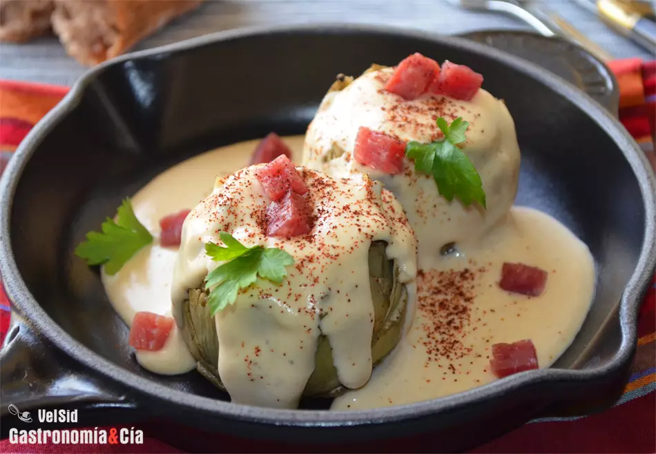 Sirve dos alcachofas por persona y nápalas con la salsa de queso ahumado. Reparte unos dados de jamón serrano y decora con unas hojas de perejil. Si quieres darle un toque picante y ahumado, espolvorea una pizca de chipotle en polvo. ¡Buen provecho!