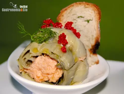 Si vas a servir las alcachofas en un plato llano, la parte que haga de base la puedes cortar para que quede plana y no se vuelque en el plato (el trocito que retires guárdalo con los pies de la alcachofa). Reparte las rillettes de salmón en las cuatro bases de las alcachofas y coloca la parte superior de la misma en cada una de ellas.