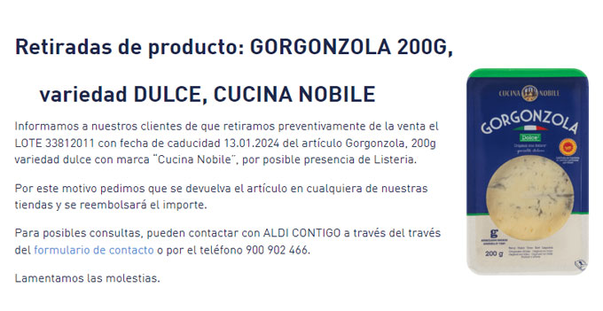 Aldi ha retirado el queso Gorgonzola dulce por posible presencia de Listeria, se trata del producto que comercializa la marca Cucina Nobile y el lote afectado es el número 33812011 con fecha de caducidad 31.01.2024. Sabréis que este queso azul se comercializa en un envase de 200 gramos, en las fotos podéis ver cómo se presenta.