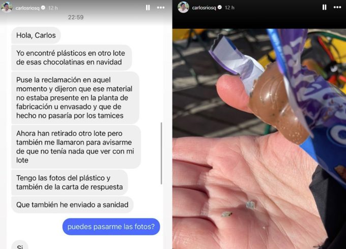 Pero, ¿podemos tener la certeza de que sólo está afectado ese lote? Lo que sí podemos es ponerlo en duda y os contamos por qué. Y es que a través de las historias de Instagram de Carlos Ríos (@carlosriosq) hemos visto lo que también podéis ver vosotros a continuación, un seguidor de Carlos le explica que el pasado mes de diciembre ya encontró fragmentos de plástico en otro lote de las mismas chocolatinas.